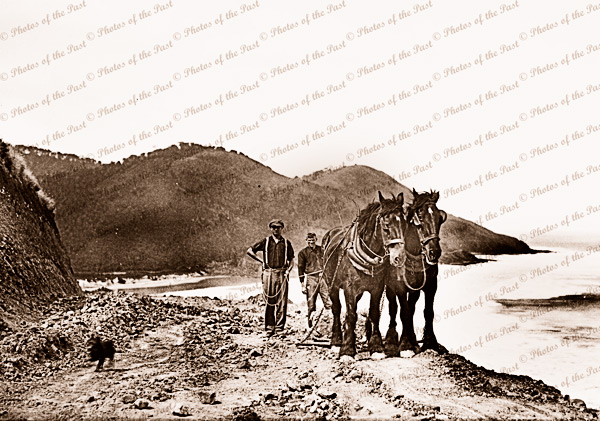 Construction of Great Ocean Road. Workers with horse team. Vic. c1920s