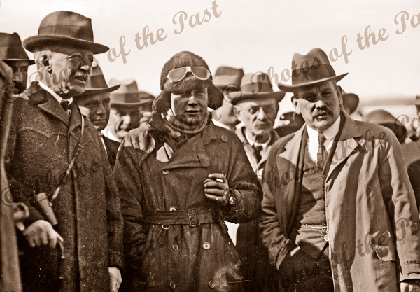 South Australian Governor (left), Harry Butler, Chief Justice Geo. Murray & crowd. After epic flight across Gulf St Vincent. The first flight across water in Southern hemisphere. August 1919
