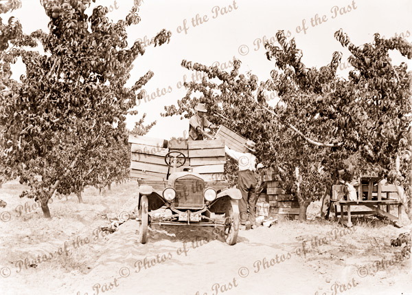 Loading boxes of peaches onto buckboard utility in an orchard. c1930s. Car