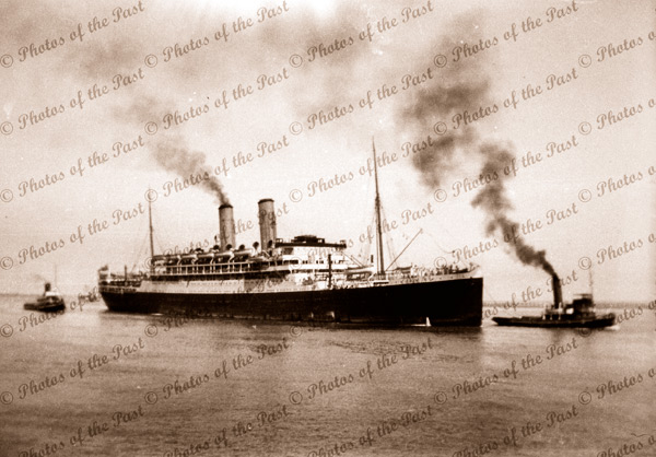 ORONSAY at Outer Harbor, SA. Tugs WOONDA & FOREMOST. 1928. South Australia. Shipping