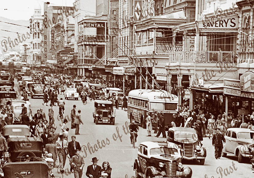 View down crowded Rundle St. Adelaide. S.A. with trolly buses. c 1940