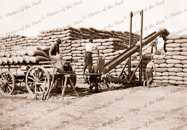 Stacking wheat at Sheep Hills, Victoria, c1950. conveyor belt